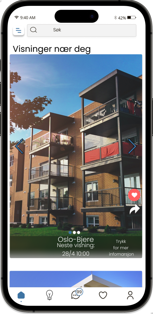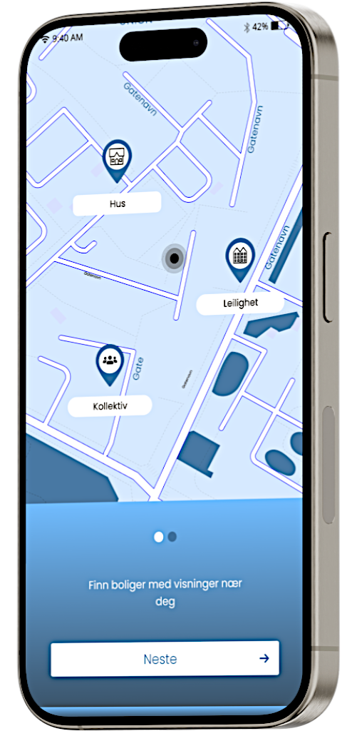 Appen gir deg muligheten til å utforske boligområder med letthet. Med vårt kartverktøy kan du enkelt søke etter boliger i spesifikke områder, finne nærliggende tjenester og skape deg et helhetlig bilde av lokalområdet. Kartet gir deg oversikt og nøyaktig informasjon om tilgjengelige eiendommer i sanntid, og om potensielle visningstider.